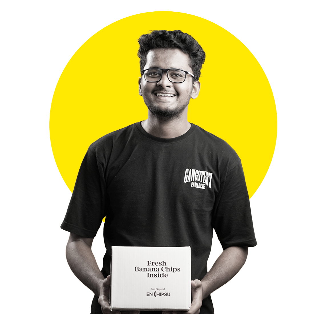 Meet Vishwa, the founder of Enchipsu, who turned his passion for snacking into a thriving brand. Vishwa blends tradition with technology in the food industry and loves experimenting with new flavors. This creative spirit led to the introduction of peri peri and jalapeno cheese banana chips—an exciting first for Nagercoil Banana Chips!