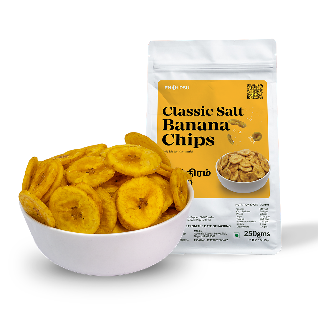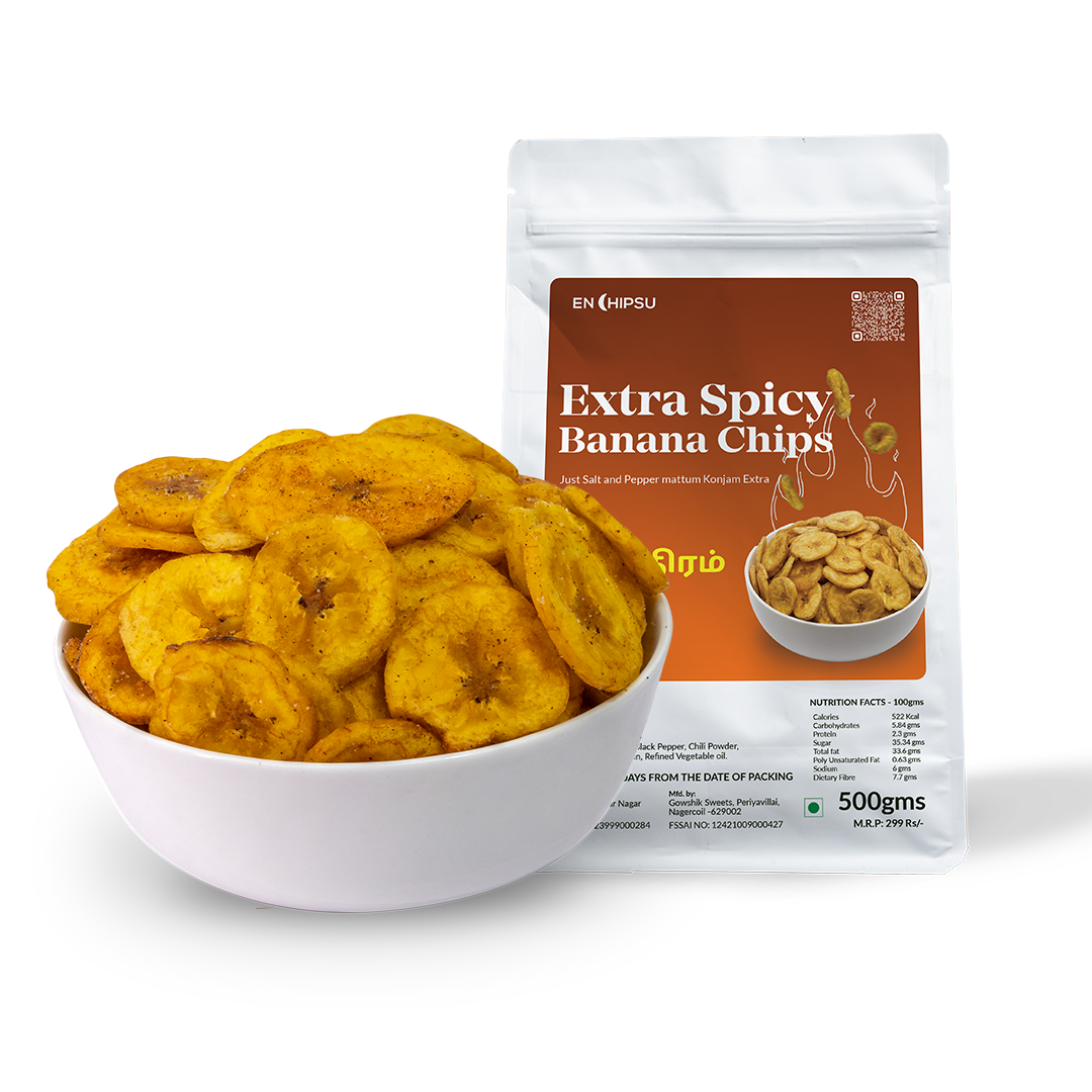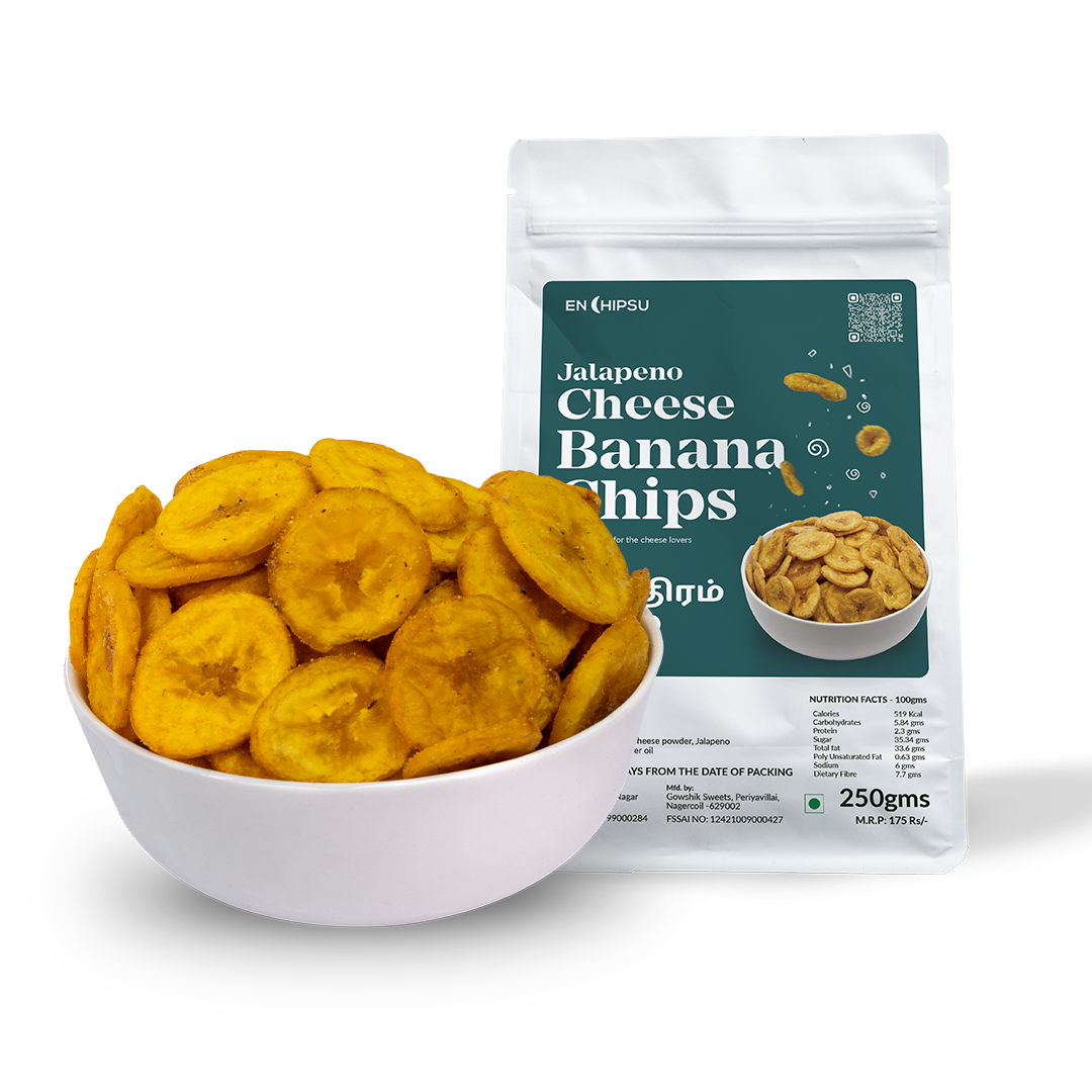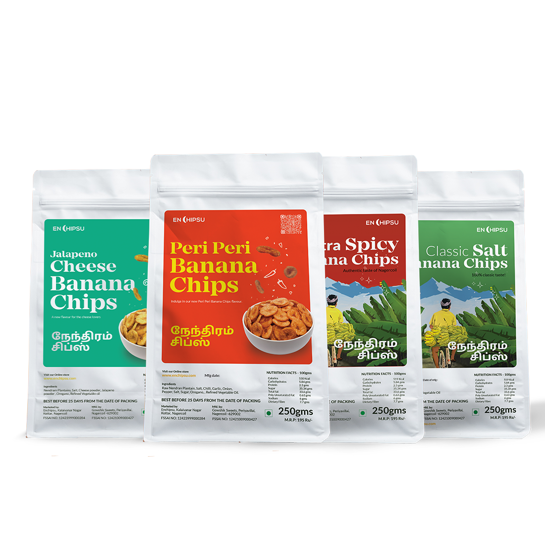 Try our 4 Flavours Combo and experience the taste sensation of Peri peri, Jalapeno Cheese, Extra Spicy, and Classic Salt Nagercoil Banana Chips. Satisfy your cravings with our newest flavors, exclusively available at enchipsu. Perfect for any snack time, grab your combo pack now!
