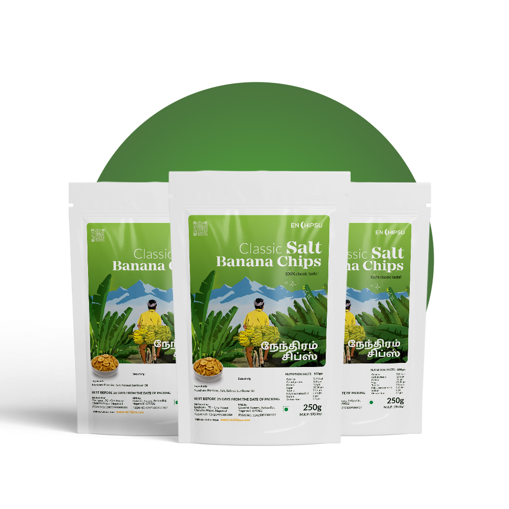 Introducing Fresh Banana Chips - Classic Salt flavour made from the finest Nendran Bananas sourced from Nagercoil, the land of coconuts and bananas. Our classic salt flavour will amaze your taste buds with its perfect balance of saltiness, making it an irresistible snack for all occasions.