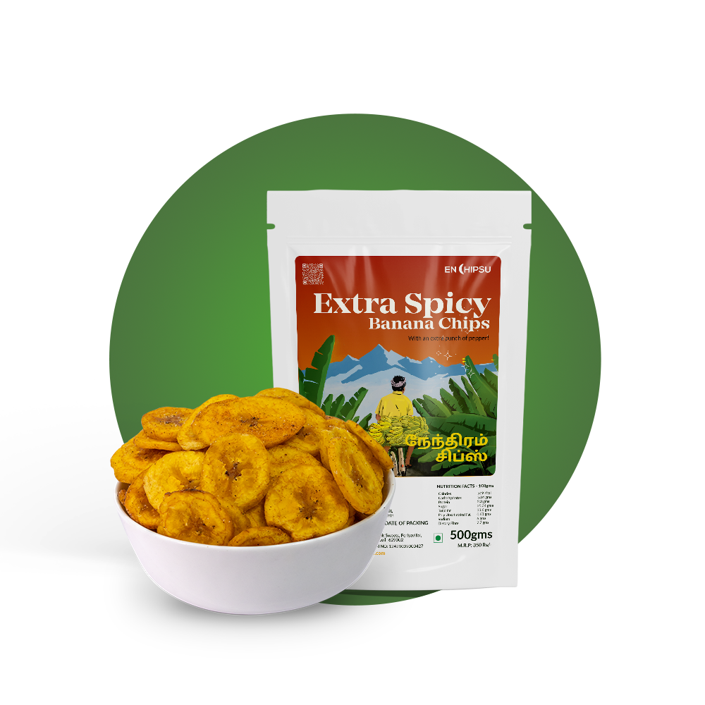 Our Extra Spicy Banana Chips are seasoned with extra black pepper and salt, giving them a bold and spicy taste that's sure to leave your taste buds tingling with excitement. Made in authentic Nagercoil style, our chips are thicker and puffier in looks and have a satisfying crunch with every bite.